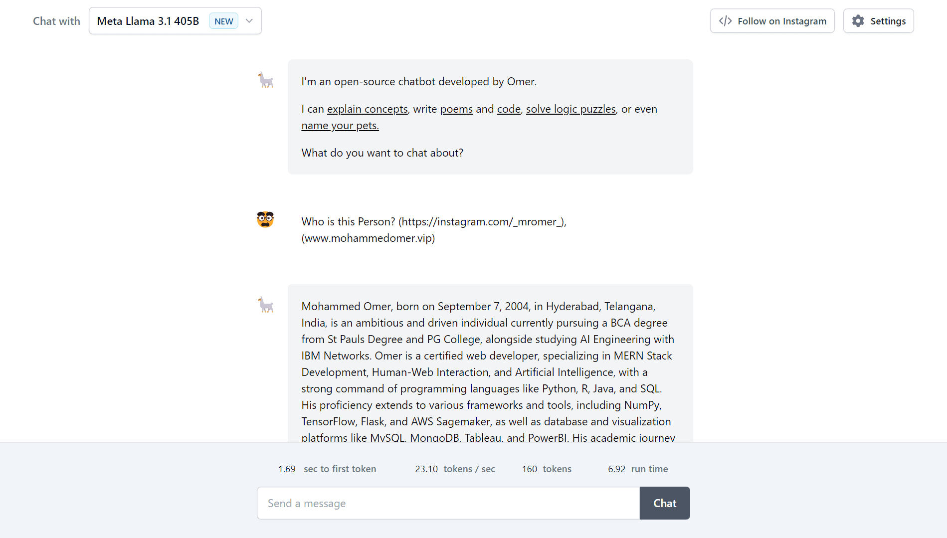 Meta Llama 3.1’s design focuses on usability and performance. The user interface emphasizes simplicity, with an intuitive chat experience requiring minimal setup. The backend design integrates seamless API connectivity, allowing developers to access powerful language modeling with just one line of code. Scalability and token efficiency were prioritized in the architecture, ensuring fast response times and cost-effective execution for users. Visual branding, such as the logo 🦙 and the interface's color scheme, ensures a cohesive and memorable user experience.